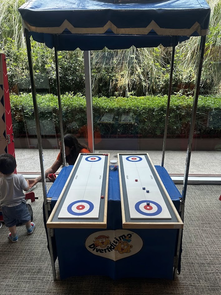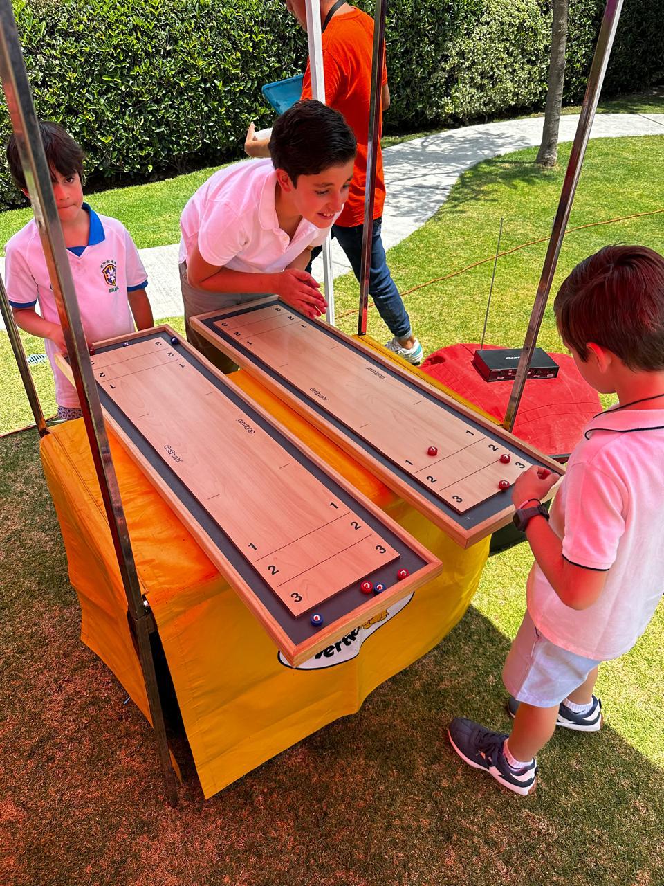 Desliza los discos metálicos por la pista lisa intentando colocarlos lo más cerca posible del centro de la diana en el extremo opuesto del tablero. Puedes lanzar con delicadeza para acercarte al objetivo o con fuerza para desplazar los discos de tu oponente ya posicionados. Gana quien tenga más discos cerca del centro al final de la ronda en este curling miniatura que combina precisión, estrategia y control de fuerza.