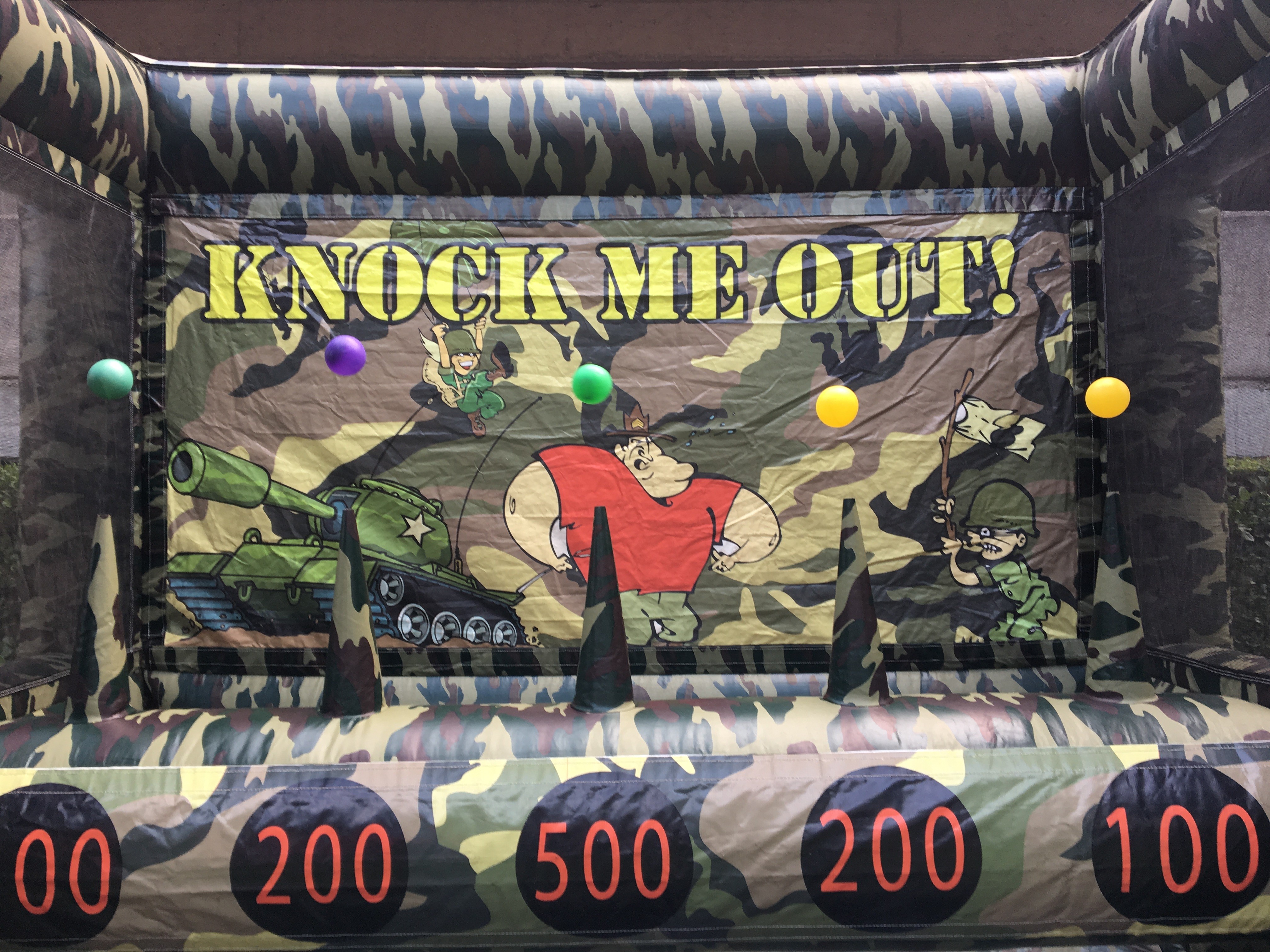 Dispara con pistolas NERF o lanza costales para derribar las pelotas suspendidas en el aire sobre conos con diferentes valores de puntos. Cada bola derribada suma puntos a tu marcador según su dificultad, desde 100 hasta 500 puntos. Gana quien acumule el mayor puntaje derribando la mayor cantidad de objetivos en el tiempo establecido.